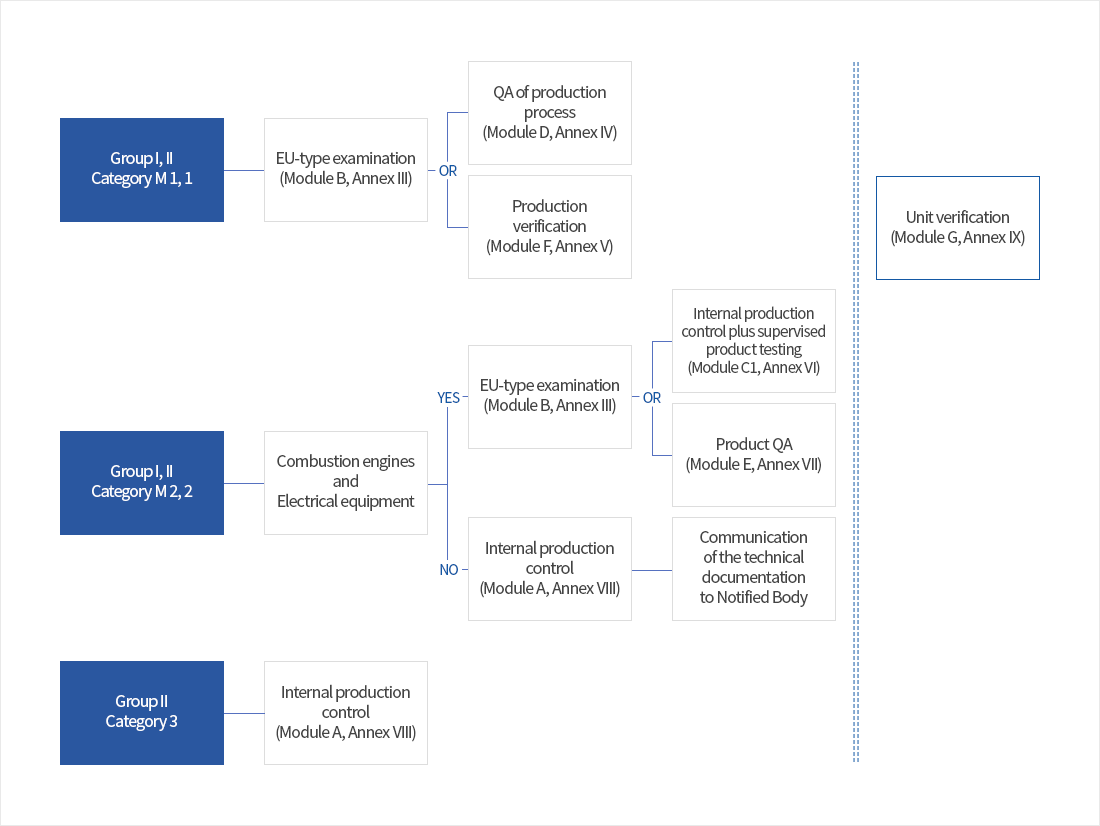 ATEX의 적합성 평가 절차는 제품의 group과 category에 따라 아래의 절차를 따릅니다.