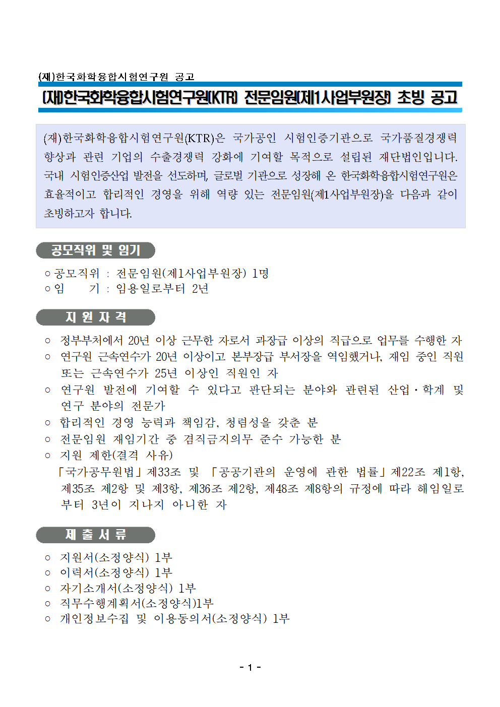 (재)한국화학융합시험연구원(KTR) 전문임원(제1사업부원장) 초빙 공고
